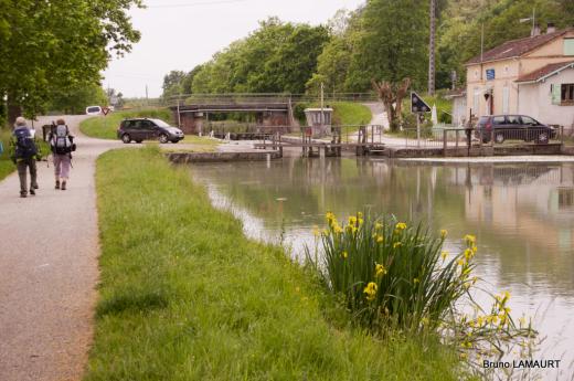 Il y a un buffet de la gare à Montauban, mais nous n’avons qu’une petite demi-heure à attendre… Nous préférons aller jusqu’à Moissac pour le petit déjeuner car nous aurons le temps. Mauvais calcul, à cette heure matinale, les cafés ne sont pas encore ouverts à Moissac. Heureusement, la boulangerie face au marché est ouverte et il est possible d’y prendre thé et café. Avec un croissant et un pain au chocolat tout frais, ça va beaucoup mieux et nous sommes prêts à partir !
